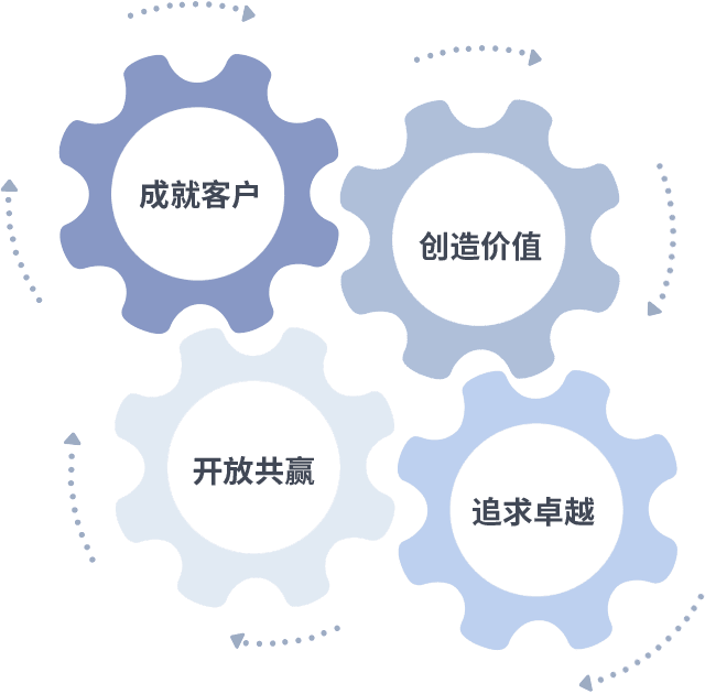 成就客户是一切决策的出发点,,,创造价值是衡量所有工作的标准,,追求卓越是我们做事做人的态度,,,开放共赢是我们的格局也是最终的结果。。价值观的齿轮环环相扣,,推动着组织里的每个人不断向前。。