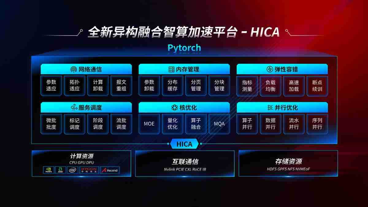 通过自研的服务层、、、中间适配层、、、以及调度编排算法,,采用数据并行、、、模型并行等多种并行方式,,,把并行计算任务进行有效的分解,,使其分别由相应的软件栈和算力资源来承接。。当GPU资源变化,,HICA可以实时动态调度计算子任务并调整模型拓扑和架构,,以充分聚合各种算力资源。。。
