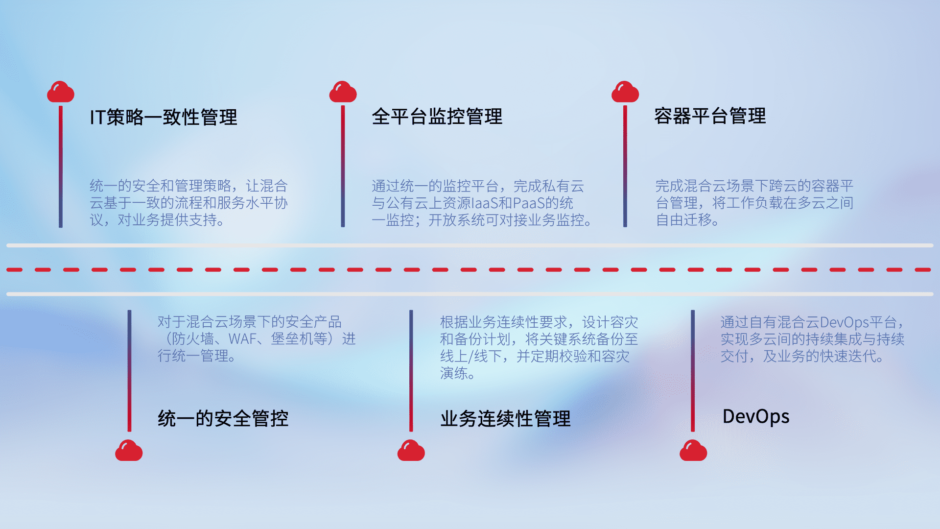 通过多云纳管,,,以统一的资源数据模型把客户的云资源进行抽象和封装,,进而实现对多云资源的统一操作,,保障云资源管理的可靠性、、、稳定性与可用性。。量身定制化运维内容,,,,配置、、、开发运维、、补丁管理、、、、备份、、、、监控、、认证和访问管理、、、、审计和日常巡检等,,保障在用云过程中的可靠度,,,,稳定度以及高可用率。。